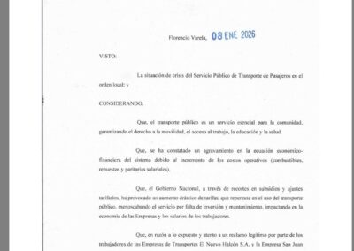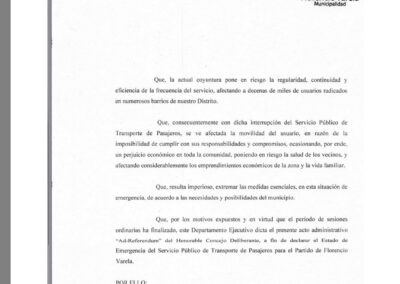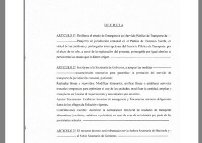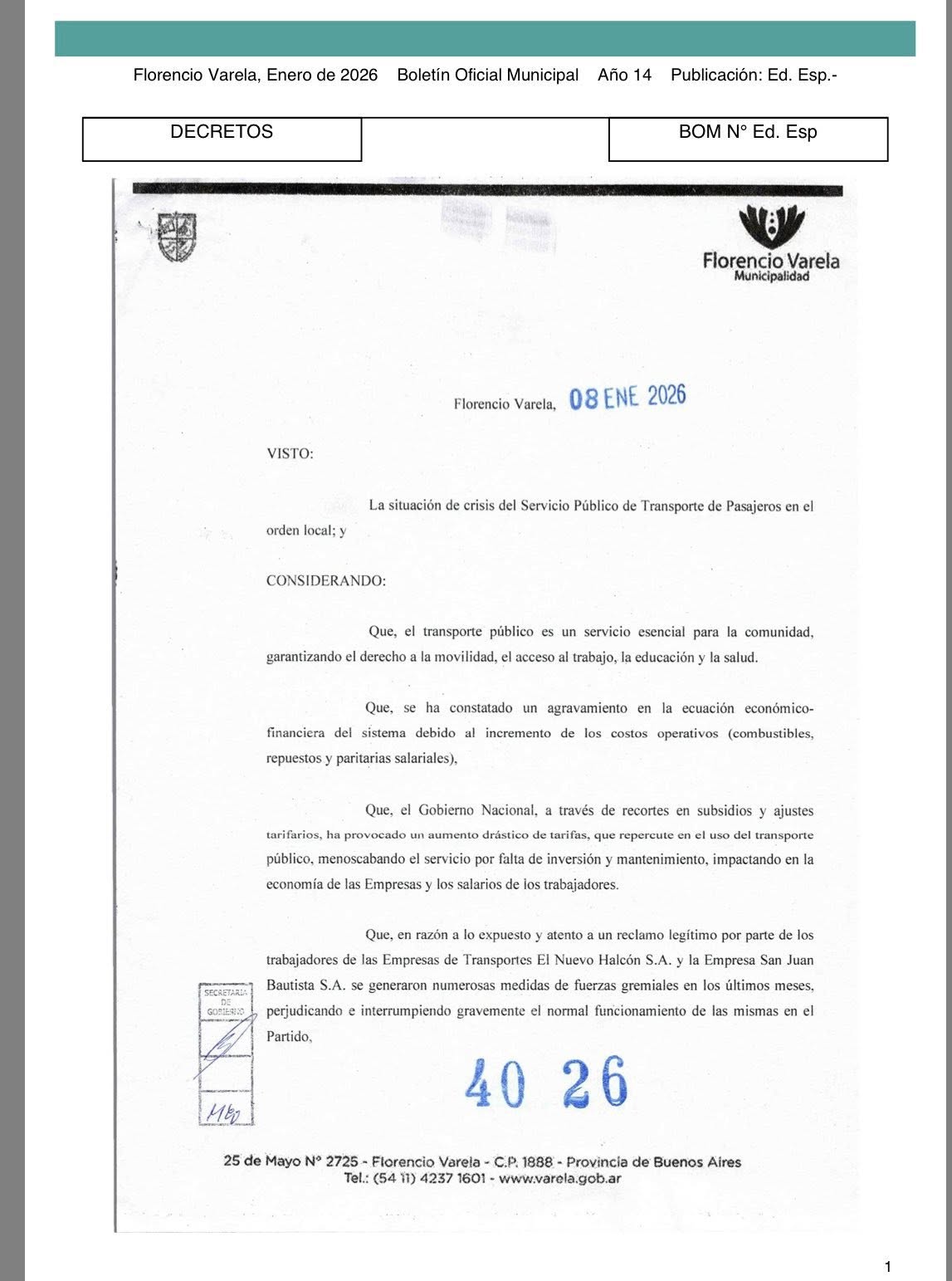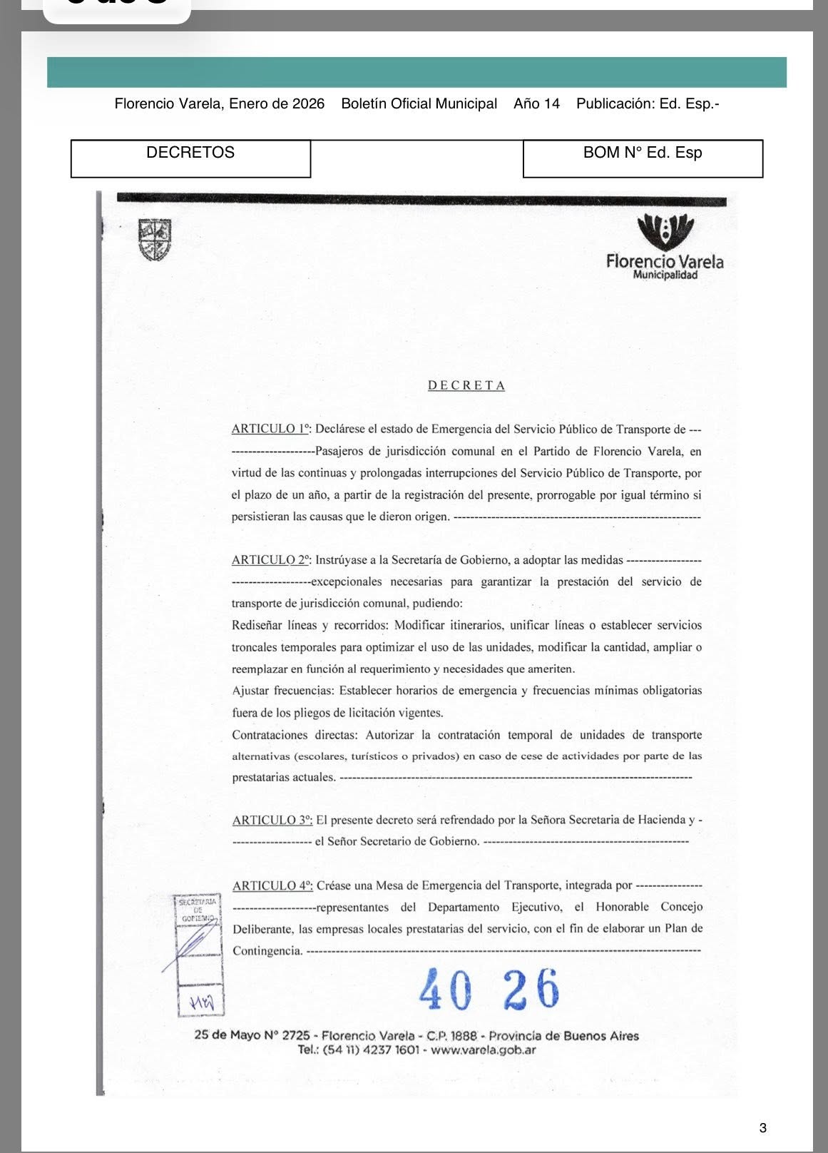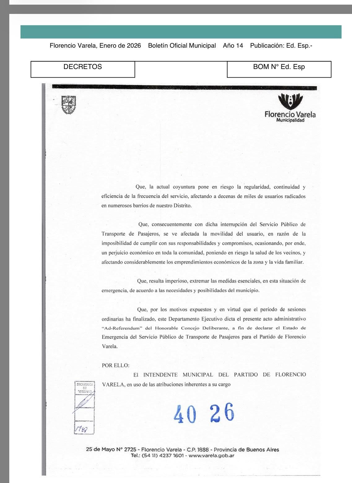 El Decreto Municipal N° 40/26 que declaró la Emergencia del Transporte Público en el Partido de Florencio Varela, mediante la cual se autorizó de manera excepcional y transitoria la incorporación de unidades no pertenecientes a líneas regulares;