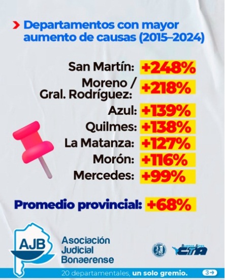 Finalmente, el fuero de Familia también refleja las dificultades estructurales que atraviesa el sistema judicial bonaerense. Un informe del Centro de Investigación y Formación de la AJB indicó que la cantidad de causas en ese fuero creció un 626% en catorce años, mientras que la dotación de personal apenas aumentó un 143%.
