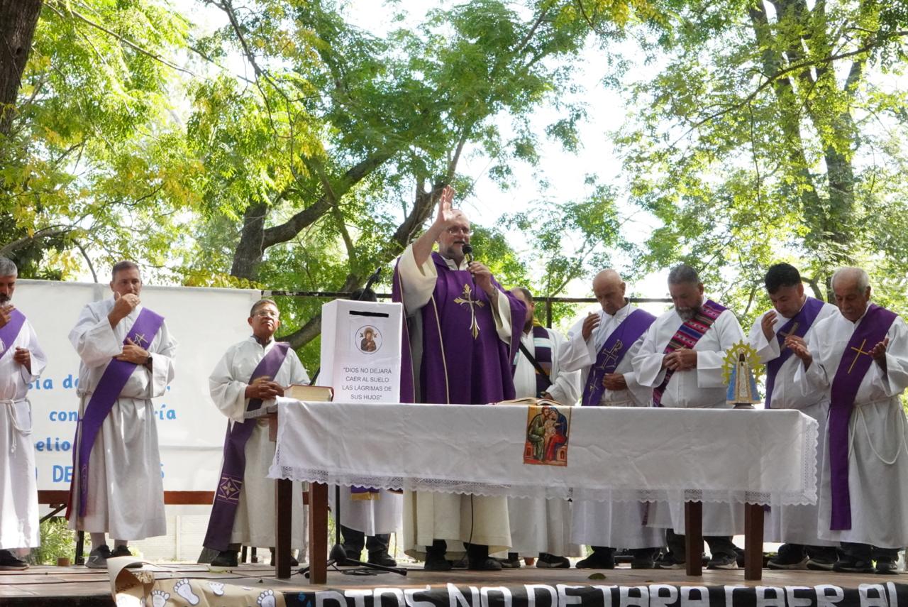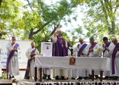 Esta expresión de fe tuvo su momento central con la Misa que presidió el Padre Obispo Eduardo Redondo, auxiliar de la diócesis, que acompañó la peregrinación a pie desde la Plaza del Mate. El Obispo acercó nuevamente los saludos de Monseñor Tissera, y presentó una caracterísitica distintica del Santo Cura Brochero, que «en su entrega dejó su cuerpo y tomó el pecado de quienes amaba».