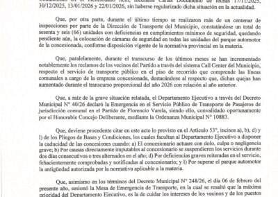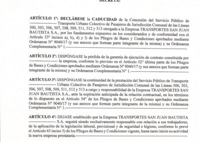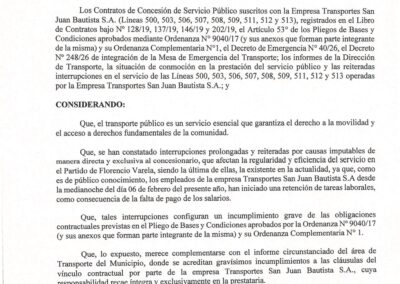 Un mes después de formalizar el Estado de Emergencia del Transporte Público en el partido, a partir de la normativa 40/26 respaldada por el Honorable Concejo Deliberante en sesión extraordinaria, el Alcalde dictaminó la caducidad de la concesión a «Transportes San Juan Bautista S.A.».