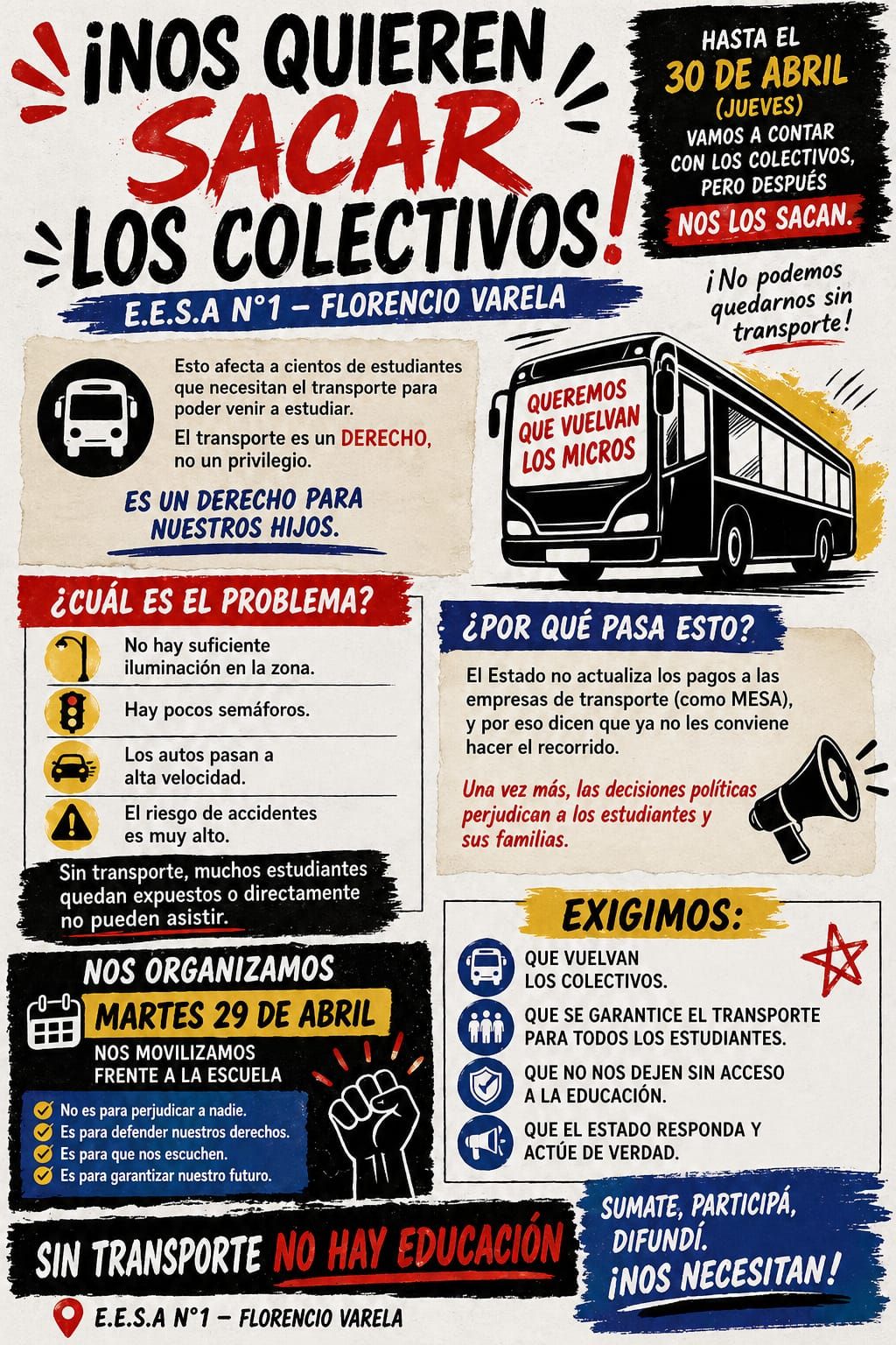 Desde Febrero pasado la conversación en las redes sociales viene dando cuenta que el 30 de Abril de 2026 este servicio finaliza su concesión y corre serio peligro su continuidad. Los aumentos indiscriminados de los combustibles, permitidos por el gobierno nacional en el marco de la mentada desregulación de todo, tiene clara incidencia sobre el servicio del transporte escolar. Y es tanta la incidencia negativa que el Consejo Escolar de Florencio Varela ha llamado a licitación para ofrecer la concesión del servicio y no hubo interesados en la oferta.
