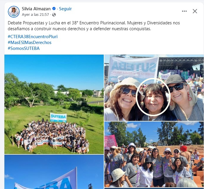 La varelense Silvia Almazan, dueña de la casa donde ocurrió el Triple Crimen de Villa Vatteone en septiembre pasado y dirigente del SUTEBA bonaerense apareció en público y lo hizo como referente del gremio de la educación en el 38 Encuentro de Mujeres que se desarrolla hasta mañana en la capital de Corrientes.