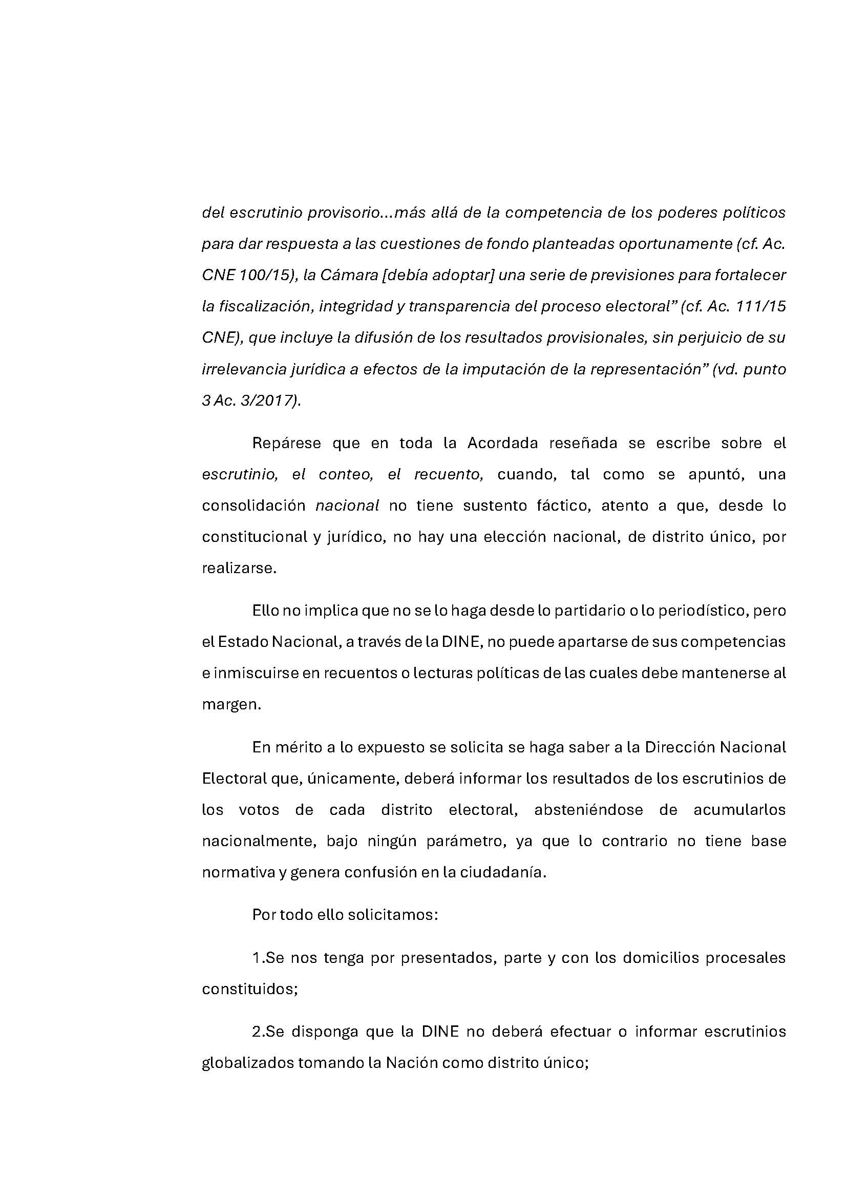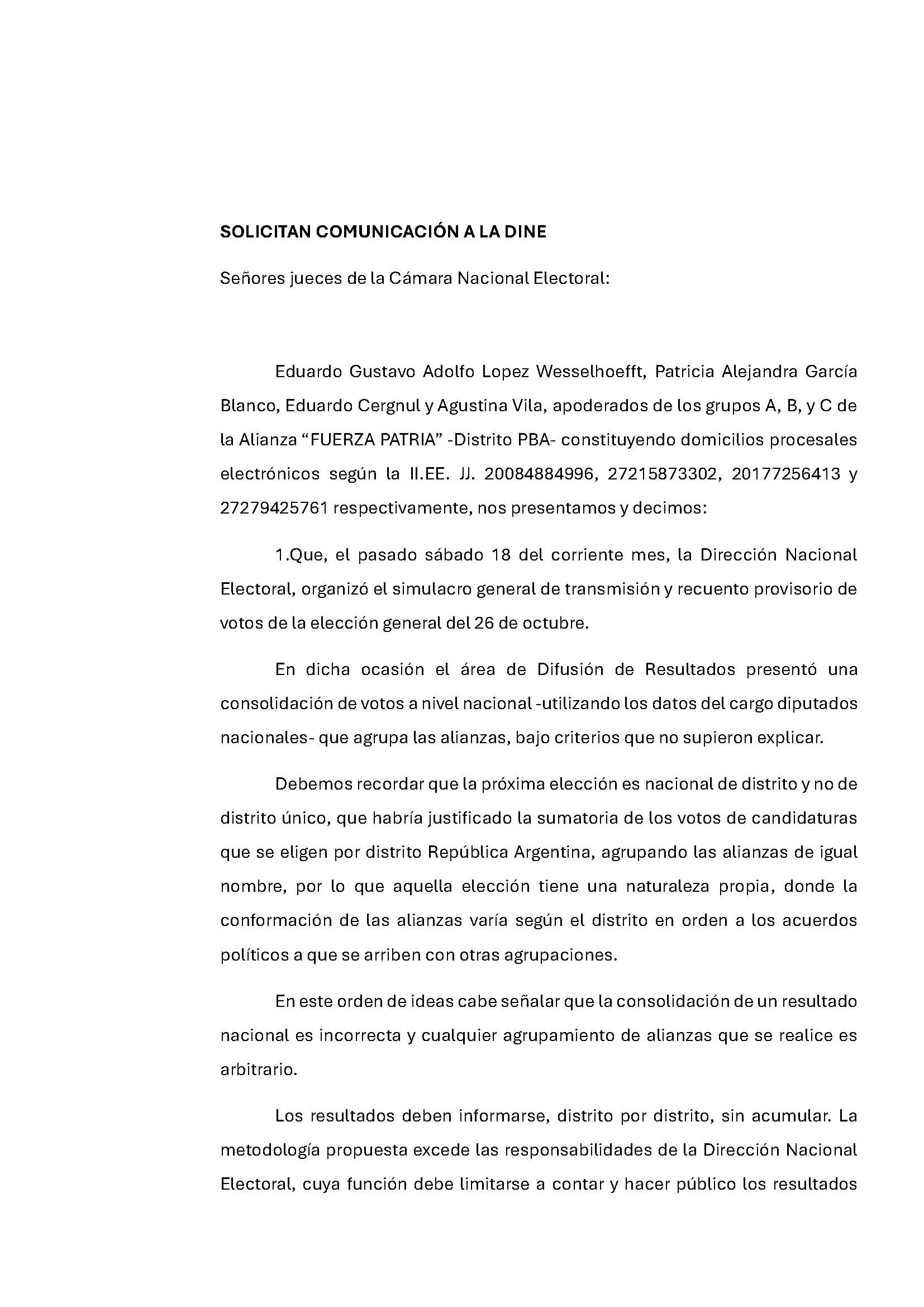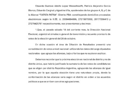 A través de la presentación, los apoderados de la coalición opositora buscan cambiar la forma en que se va a hacer el recuento provisorio porque el actual beneficiaría al oficialismo. Por ello le pidieron a la Dirección Nacional Electoral (DINE) que no efectúe o informe “escrutinios globalizados tomando la Nación como distrito único”.