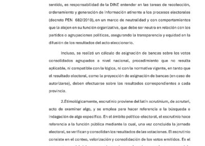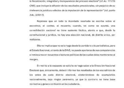 En ese sentido solicitaron a la DINE, el organismo encargado de hacer el conteo provisorio de votos la noche de la elección, informe los resultados “absteniéndose de acumularlos nacionalmente, bajo ningún parámetro”. Y en agregaron: “Lo contrario no tiene base normativa y genera confusión en la ciudadanía”.