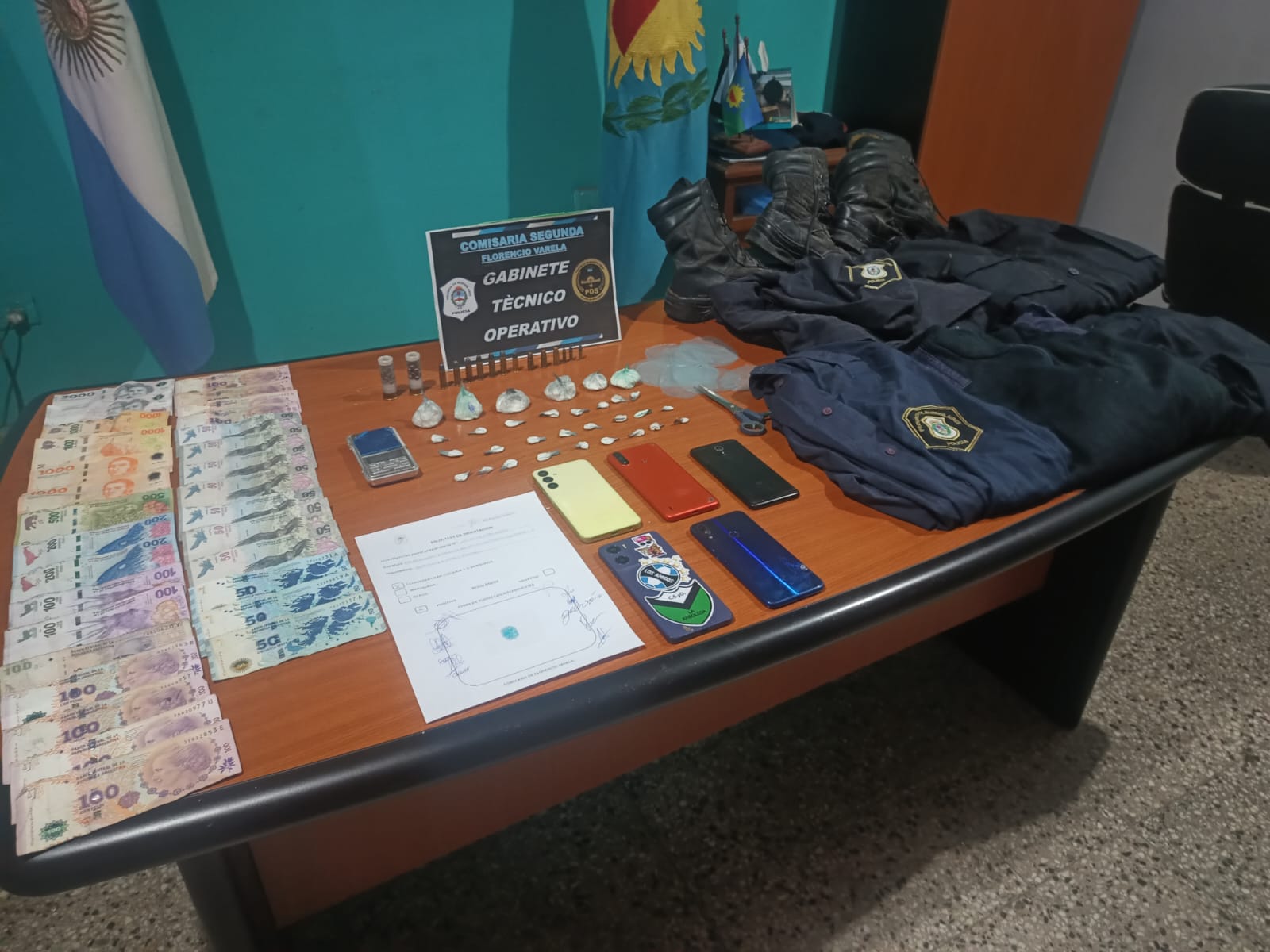 En la requisa, los agentes incautaron 30 envoltorios de clorhidrato de cocaína junto con elementos para su distribución: recortes de nylon y una balanza de precisión. Asimismo, hallaron dinero en efectivo, cinco teléfonos celulares, vestimenta policial más municiones de distintos calibres.