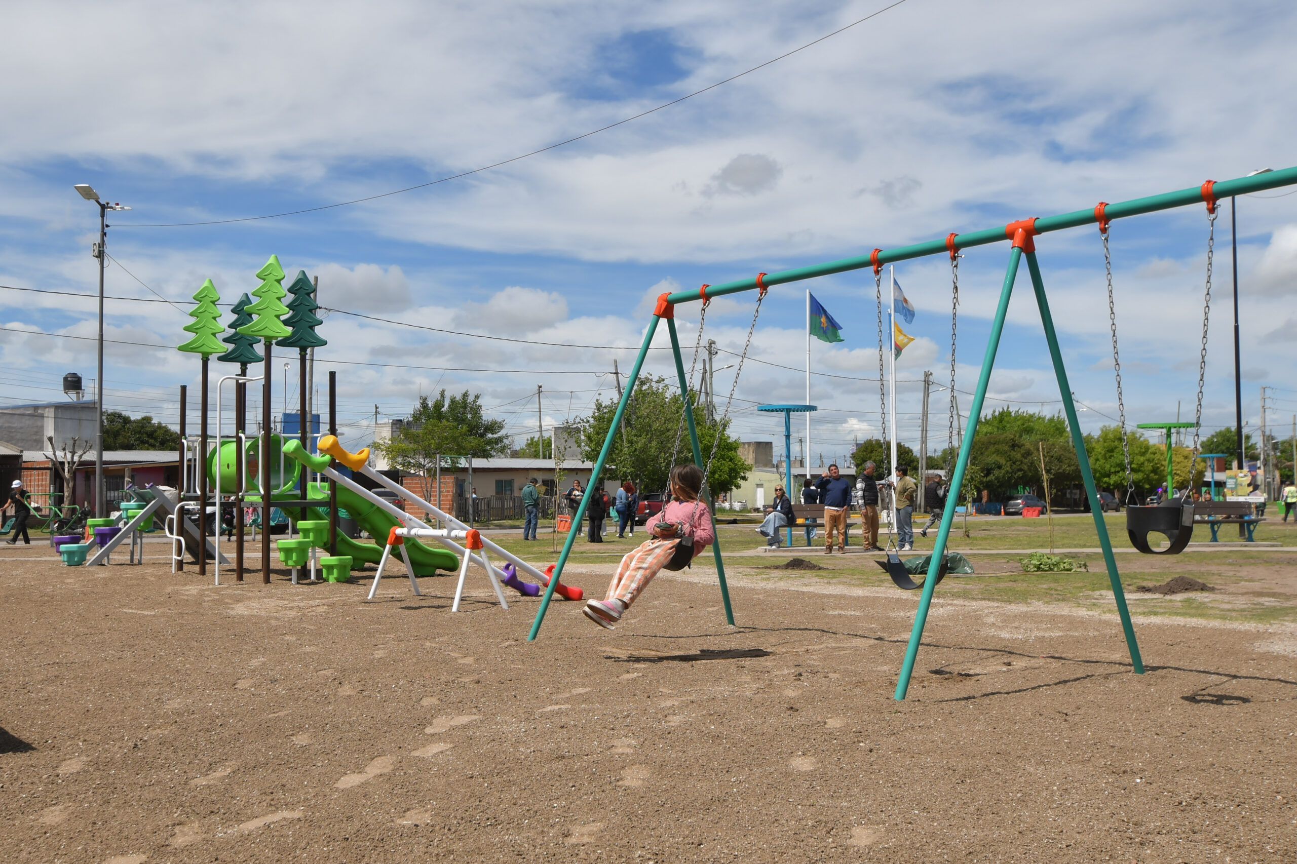 El jefe comunal -Andrés Watson- junto a la presidenta de la Fundación Banco Provincia -Micaela Ferraro- conversó con frentistas tras la finalización de la puesta en valor del parque ubicado en calle 523 esquina 554, lindero a la edificación de un nuevo inmueble sanitario de atención primaria.