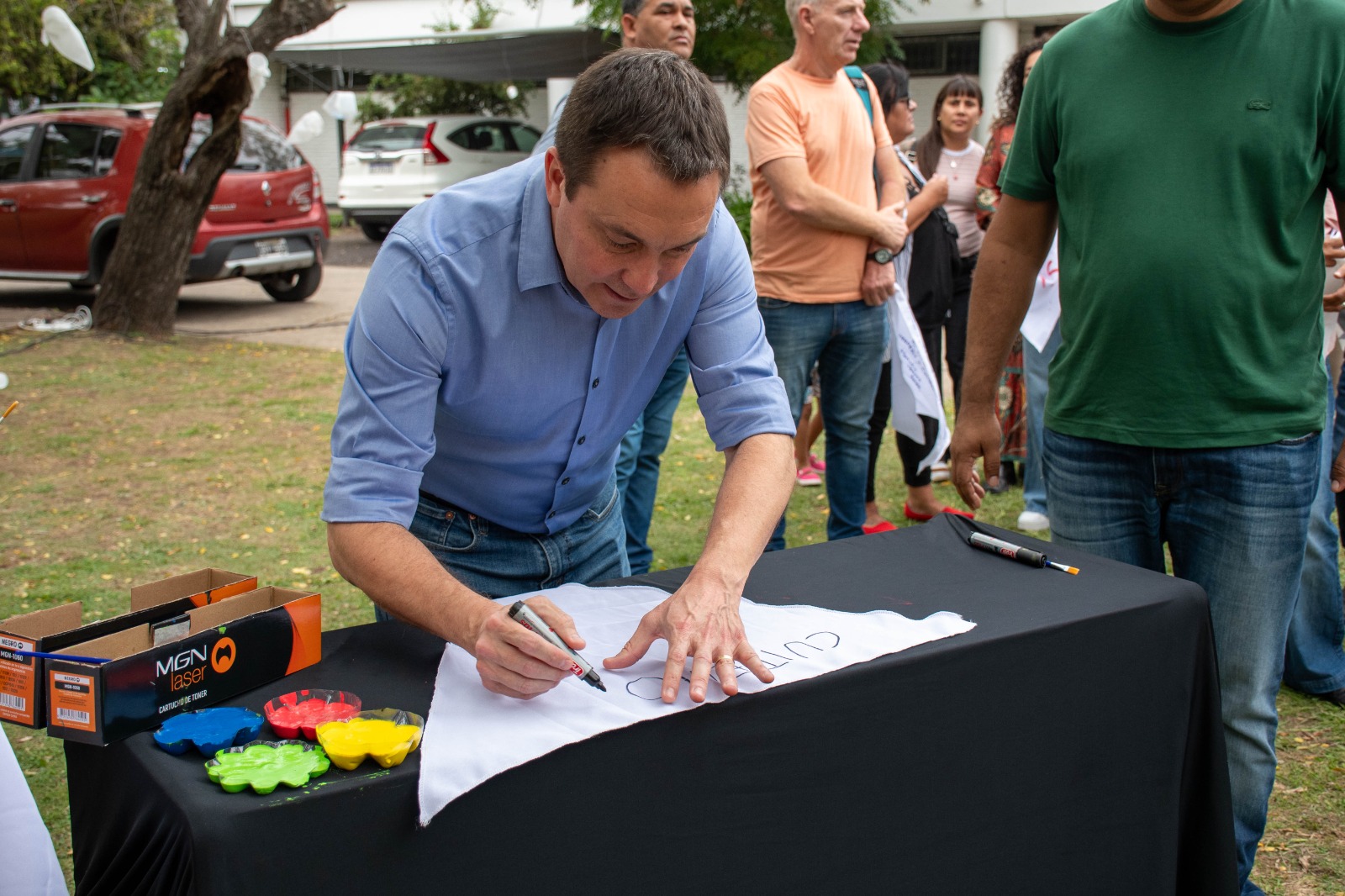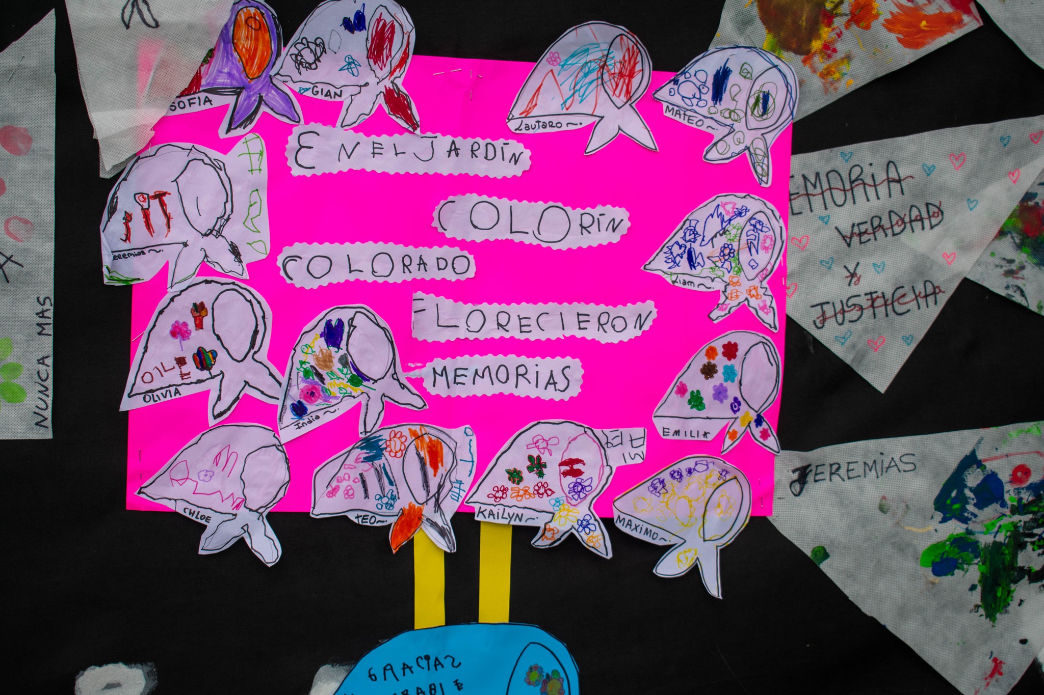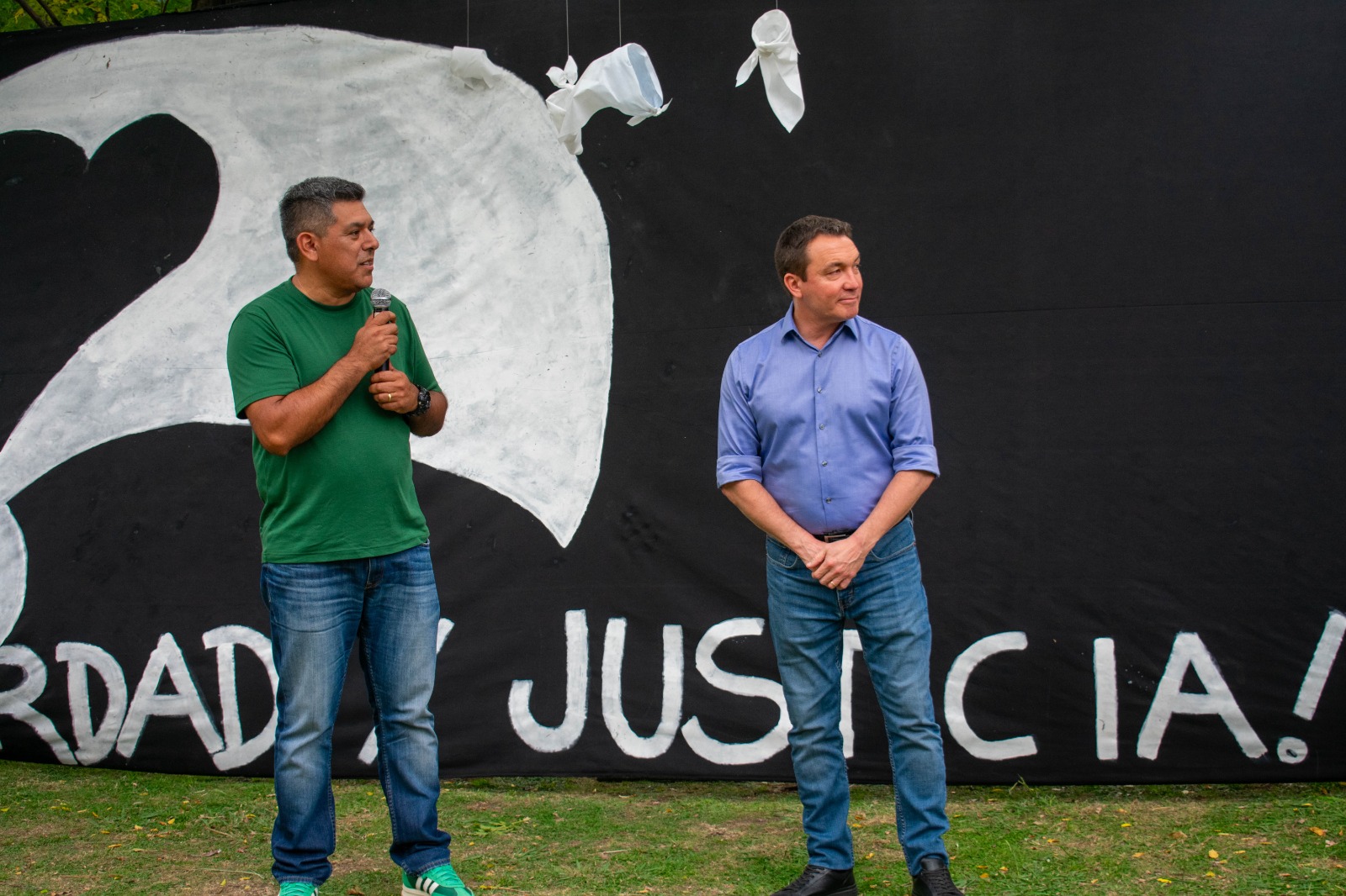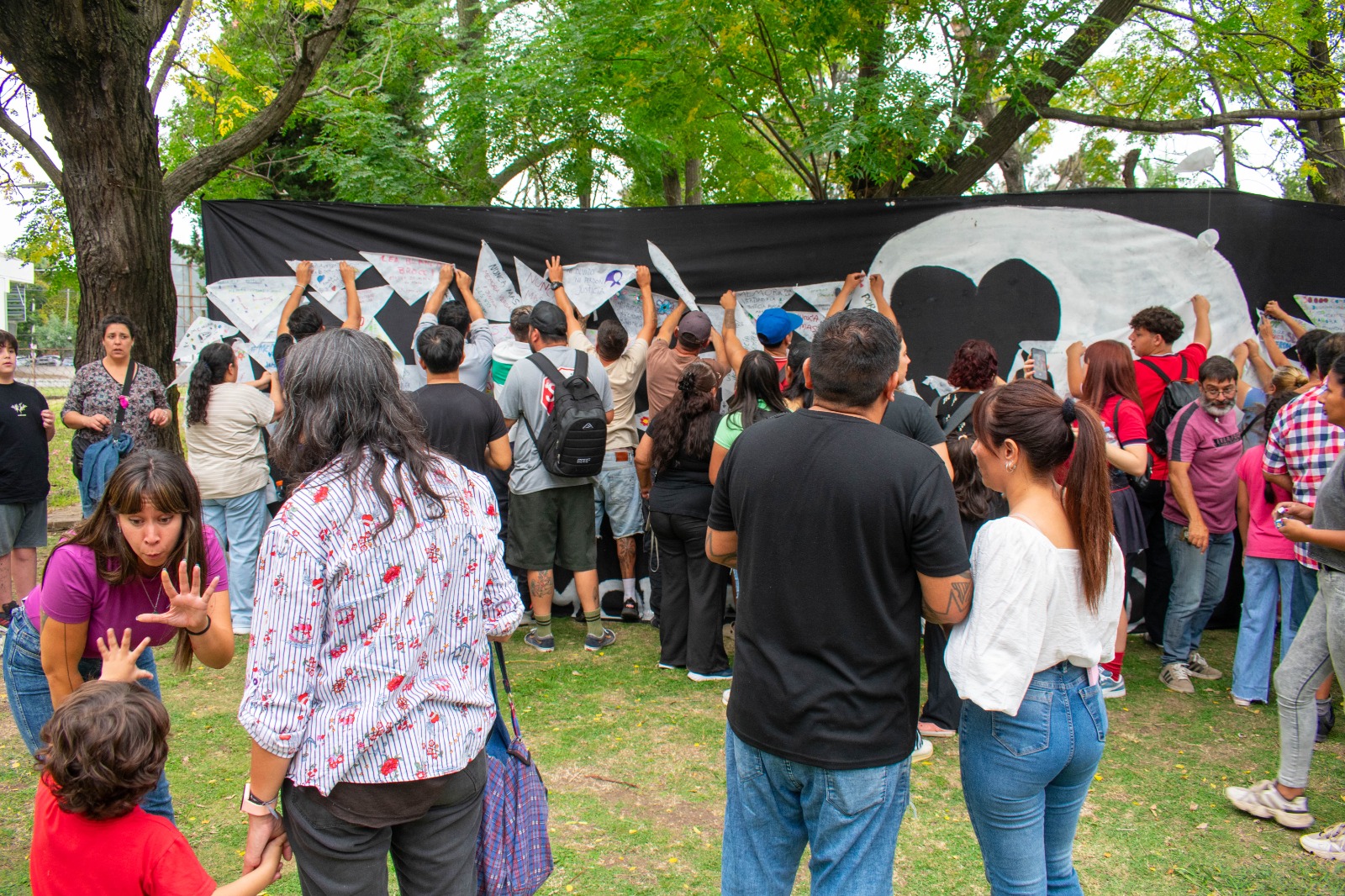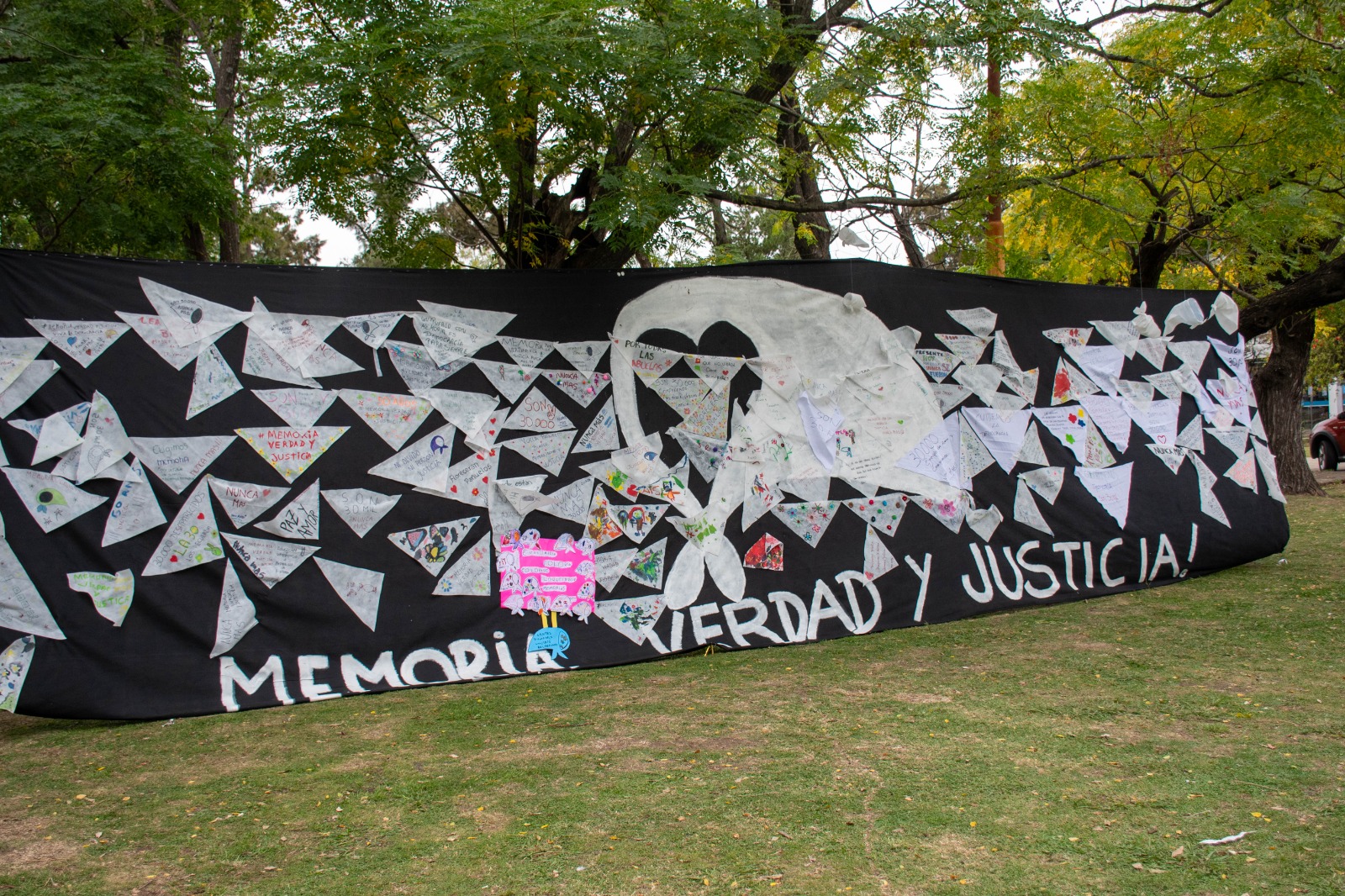 “La convocatoria reunió a una multitud heterogénea que refleja la esencia de la lucha por los derechos humanos: jóvenes estudiantes de nivel secundario, niños y niñas de jardines de infantes, vecinos autoconvocados, miembros de la comunidad educativa en pleno y funcionarios municipales. Todos ellos fueron protagonistas de una intervención participativa única, donde cada asistente fue invitado a tomar un pañuelo blanco y plasmar en él, o en mensajes escritos, su propio pensamiento, su dolor, su esperanza o su compromiso con la memoria histórica” indicó el informe de prensa y a renglón seguido blanqueó lo señalando más arriba. El informe agregó y sin tocarle una coma: